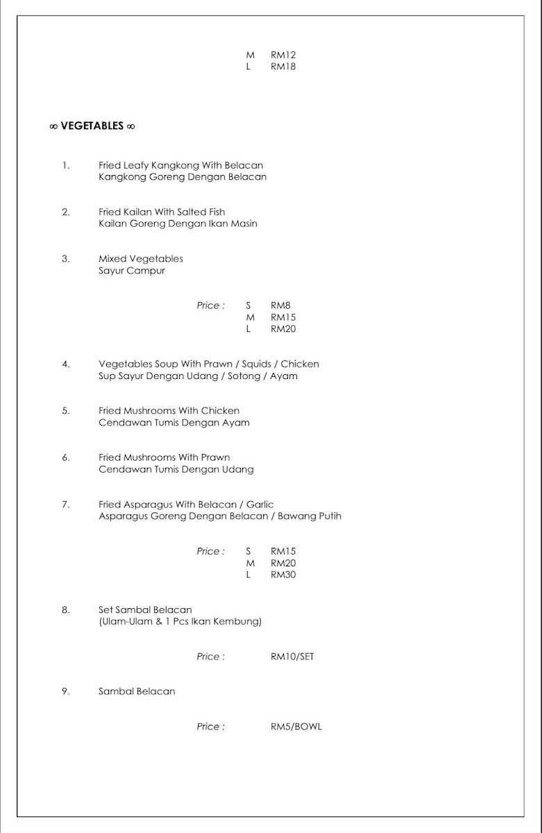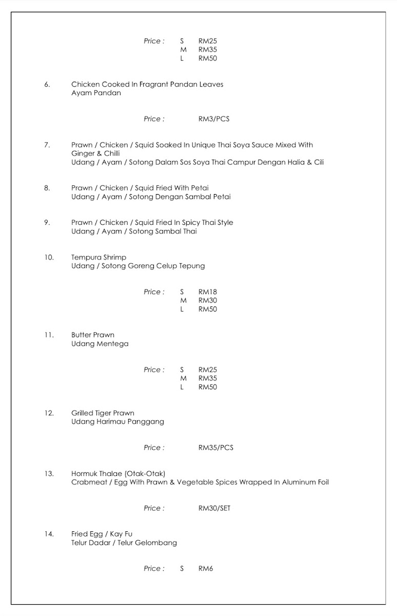 Guests can expect to enjoy highlights such as the Tomyam Seafood Combination, rich with layers of spice and tang, or the Siakap prepared either steamed with sliced ginger or served in a distinctive sweet and sour sauce. Lighter options like Mango Salad and Leafy Kangkong Fried with Belacan provide refreshing contrasts, while Butter Prawns and Otak-Otak add satisfying bursts of flavor.